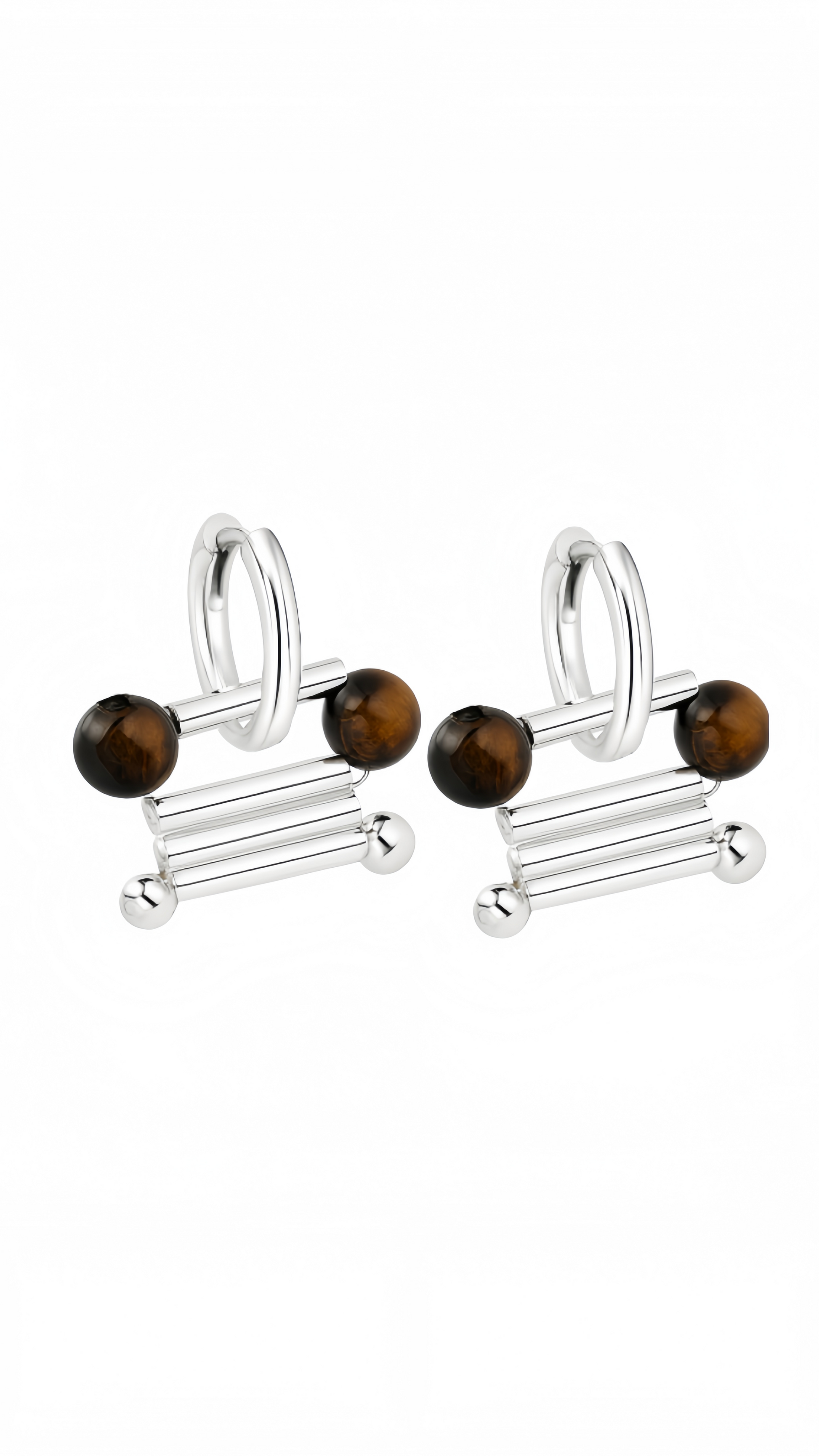 The "Balance" earrings pay tribute to harmony with a sculptural gesture - harmony in form, culture and contrast. The polished silver bars are interwoven with the deep tiger's eye stone spheres, echoing the yin and yang duality of softness and hardness, stillness and movement. The simple ring design frames the overall composition with calm confidence.
